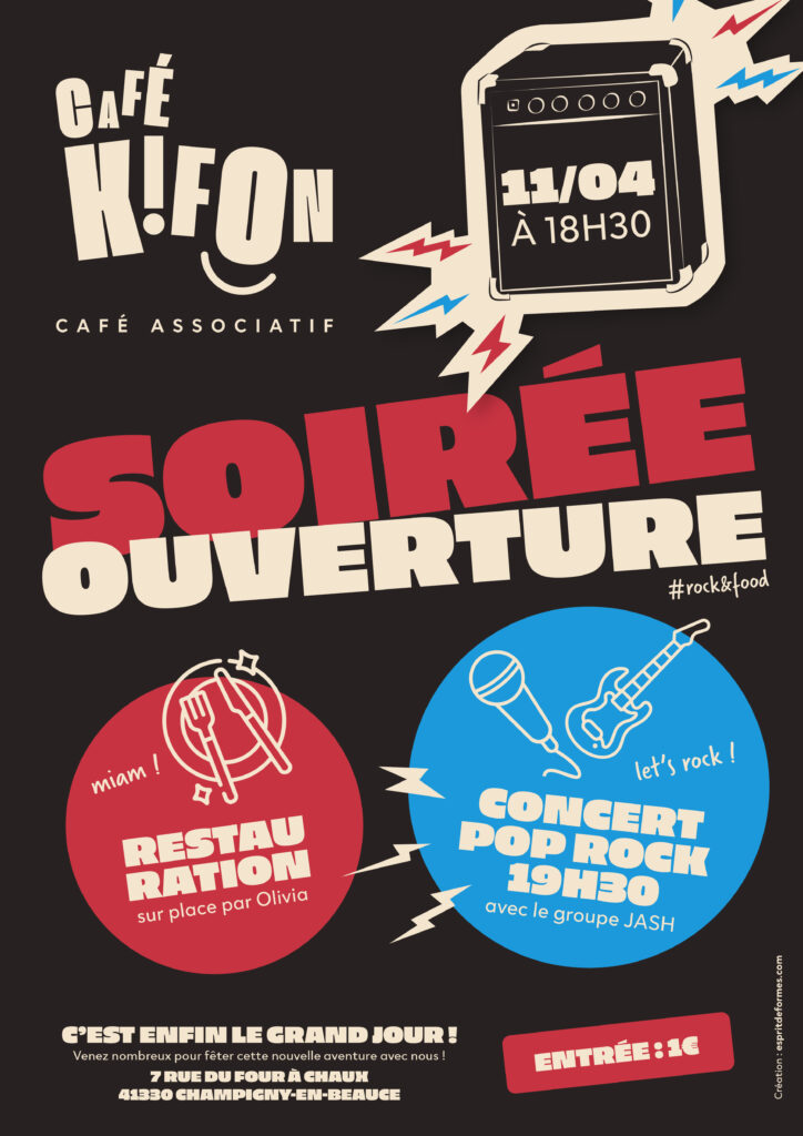 Samedi 11 avril à 18h30, venez célébrer l’ouverture de notre café associatif à Champigny-en-Beauce ! Au programme :✅ 18h30 : Découverte du lieu.✅ 19h30 : Concert pop-rock avec le groupe JASH 🎸✅ Toute la soirée : Restauration assurée sur place par Olivia. 📍… Lire la suite : !!! ERRATUM date : SAMEDI 11 avril 🎉 !!! - 🎸🍽️ INAUGURATION DU CAFÉ KIFON – C’EST PARTI ! 🎸🍽️